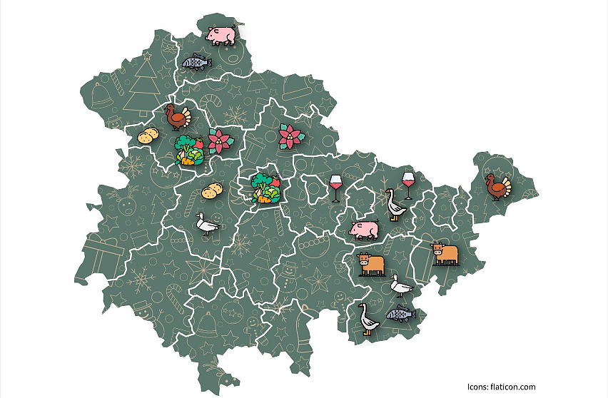 Wer bei den Zutaten für das Festmenü auf regionale Produkte setzt, unterstützt nicht nur die 3.670 einheimischen Landwirtschaftsbetriebe Thüringens (Stand 2022), sondern hat durch kurze Lieferwege im Regelfall auch frische und qualitativ hochwertige Produkte mit einer deutlich besseren Umweltbilanz als bei importierten Waren. Das Thüringer Landesamt für Statistik möchte anhand einer Karte veranschaulichen, welche Thüringer Regionen bei der Erzeugung der Zutaten für das Weihnachtsessen die Spitzenreiter sind.
