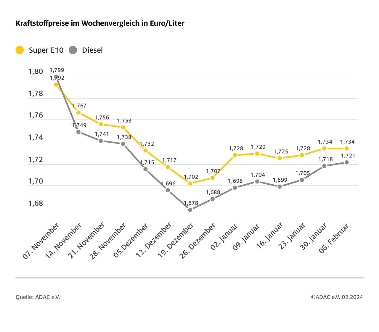 Wie die aktuelle ADAC Auswertung der Kraftstoffpreise in Deutschland ergibt, kostet ein Liter Super E10 im bundesweiten Mittel 1,734 Euro und damit genauso viel wie vor einer Woche. Der Dieselpreis liegt bei 1,721 Euro, das sind 0,3 Cent Aufschlag im Wochenvergleich.