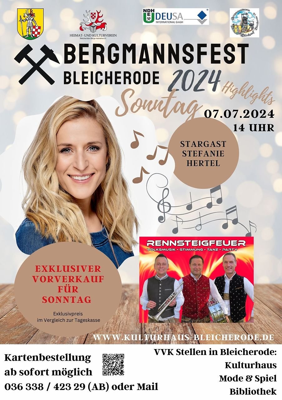 Sichern Sie sich also frühzeitig die Chance, Stargast Stefanie Hertel und das Trio Rennsteigfeuer hautnah und live auf der Festplatzbühne zum Bergmannsfest am Sonntag erleben zu können! Die drei Musiker haben bereits im März unter tosendem Applaus in unserem Kulturhaussaal aufgespielt. Und natürlich gibt Stefanie Hertel auch anschließend eine Autogrammstunde. Kartenreservierungen sind ab sofort im Kulturhausbüro möglich, unter 036 338 / 423 29 (auch AB) oder per Mail an kontakt@kulturhaus-bleicherode.de. Die frisch gedruckten Karten sind eingetroffen, Sie können diese auch bei weiteren VVK-Stellen erwerben. Diese befinden sich bei Mode & Spiel in der Wallstraße und in der Stadtbibliothek (Alte Kanzlei).