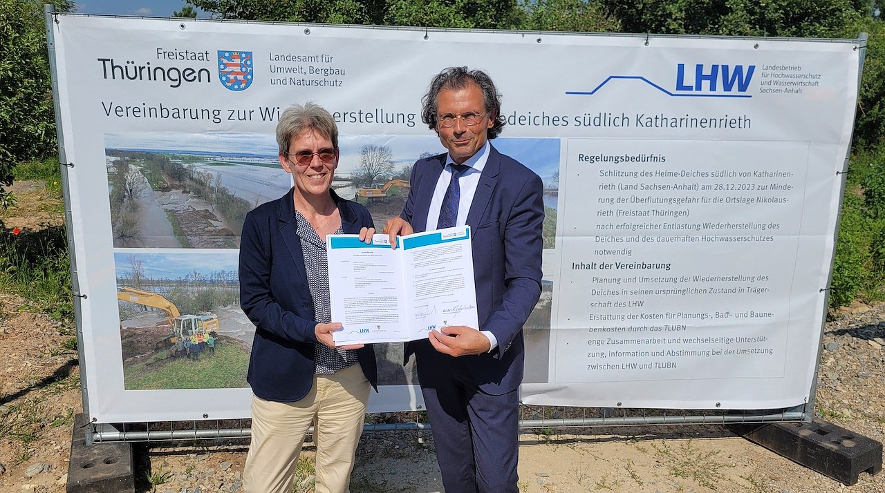 Mario Suckert als Präsident des Thüringer Landesamtes für Umwelt, Bergbau und Naturschutz (TLUBN) und Martina Große-Sudhues als Direktorin des Landesbetriebs für Hochwasserschutz und Wasserwirtschaft Sachsen-Anhalt (LHW) haben am heute eine Verwaltungsvereinbarung zur Sanierung jenes Helme-Deiches unterzeichnet, der am 28.Dezember 2023 auf dem Gebiet des Landes Sachsen-Anhalt geöffnet worden war, um die Thüringer Gemeinden Mönchpfiffel-Nikolausrieth und Heygendorf vor Hochwasser zu schützen.