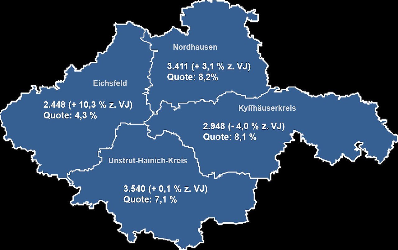 Im Eichsfeld stieg die Arbeitslosigkeit auf 2.448 Personen. Der Anstieg zum Vorjahr entspricht 10,3 Prozent und ist damit der größte im Agenturbezirk. Mit einer Arbeitslosenquote von 4,3 Prozent bleibt der Landkreis weiter der mit der niedrigsten Arbeitslosigkeit.