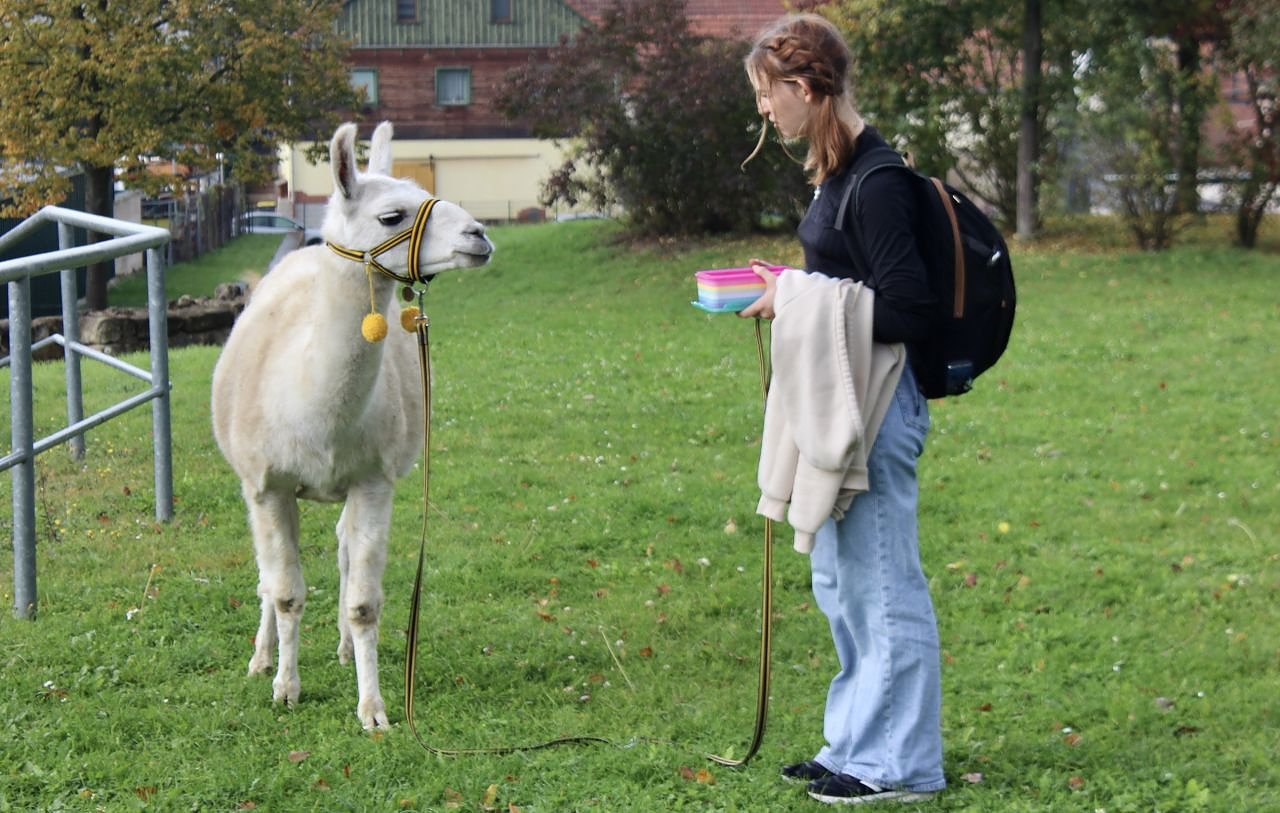 Alina Kroll hat nicht nur für ihre Lamas ein sehr gutes Gespür, sondern auch für die Teilnehmerinnen und Teilnehmer in ihren Kursen. Welches Tier zu welchem Menschen passt, erfasst sie sehr schnell. Aber auch die Tiere signalisieren mit ihrer Körpersprache, ob sie dem Menschen vertrauen oder nicht.