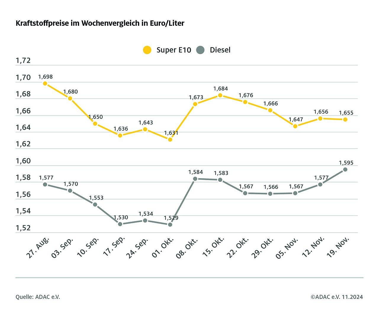 Autor: redDas zeigt die aktuelle ADAC Auswertung der Kraftstoffpreise in Deutschland. Der Preis für Super E10 sank hingegen minimal und liegt derzeit mit einem Durchschnitt von 1,655 Euro um 0,1 Cent unter dem Wert der Vorwoche. Damit hat sich der Dieselpreis bis auf sechs Cent dem Preis von Super E10 angenähert. Der steuerliche Unterschied zwischen beiden Kraftstoffsorten beträgt jedoch rund 20 Cent.
