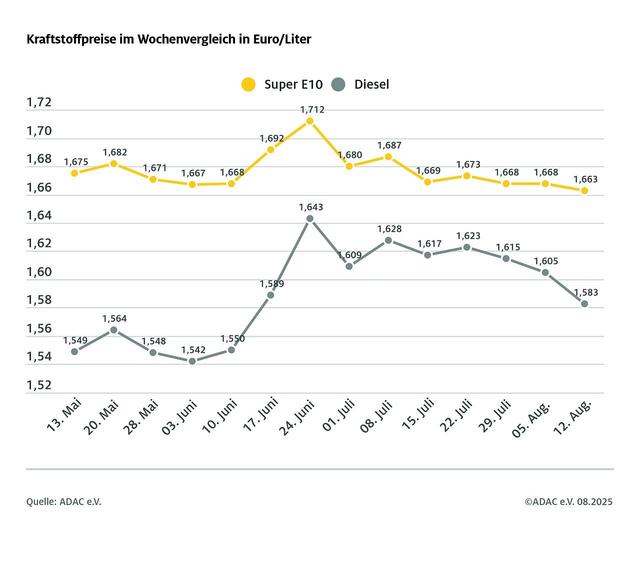 Autor: redWie die aktuelle ADAC Auswertung der Kraftstoffpreise in Deutschland zeigt, kostet ein Liter Diesel im bundesweiten Mittel 1,583 Euro – das ist ein Minus von 2,2 Cent im Vergleich zur vergangenen Woche. Ein Liter Super E10 ist um 0,5 Cent billiger und kostet derzeit im Schnitt 1,663 Euro.