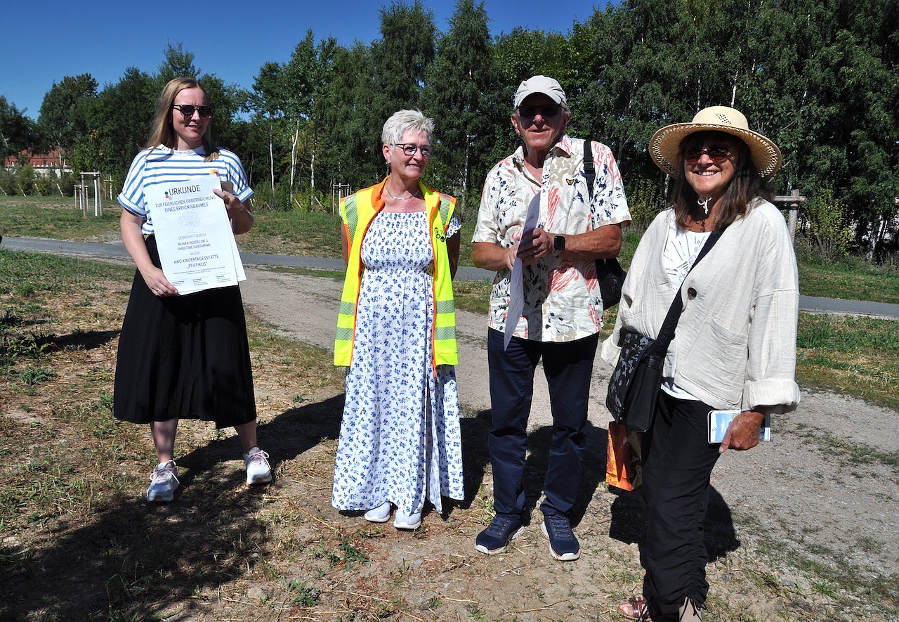 Rainer Rosdelski und Christine Hartmann nahmen die Urkunde sowie ein Dankesschreiben des Kindergartens entgegen. Darin heißt es: Wir möchten uns ganz herzlich für die Baumspende im Namen aller Kinder, Eltern und Erzieher bedanken. Wir hoffen auf ein gutes Gedeihen und später auf eine gute Ernte. Wir freuen uns, den Baum beim Wachsen begleiten zu können. Danke sagen die Kinder von der AWO-Kindertagesstätte Pfiffikus Leinefelde.