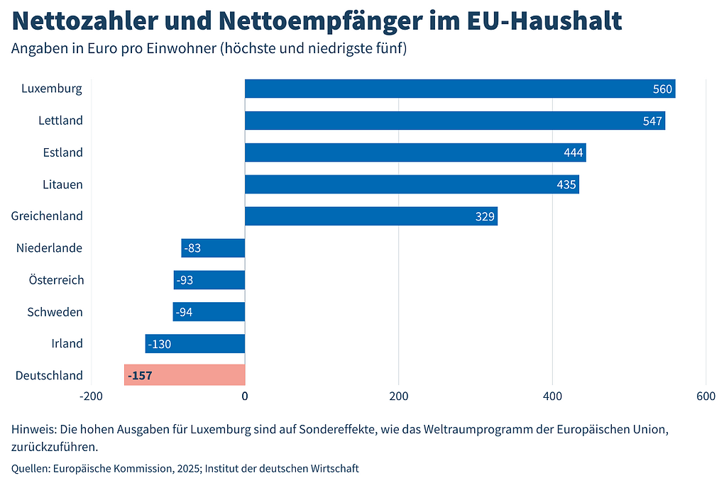Auch aufgrund der schwachen Wirtschaft sind die deutschen Nettozahlungen seit 2022 um ein Drittel gefallen. Netto rund 157 Euro hat jeder Bürger in Deutschland im Jahr 2024 an die Europäische Union gezahlt. Damit bleibt Deutschland sowohl in absoluten Zahlen mit knapp 13 Milliarden Euro als auch gemessen pro Einwohner größter Nettozahler.