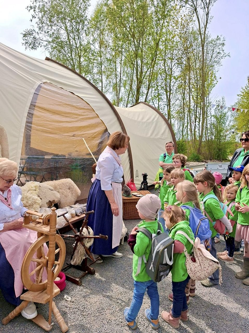 Das Grüne Klassenzimmer der Landesgartenschau Leinefelde-Worbis ist erfolgreich gestartet. Am Montag fand auf dem Gelände der erste Kurs mit den Thüringer Landfrauen statt. Unter dem Motto Vom Leine-Schaf zur Socke wurde eine alte Eichsfelder Tradition lebendig. Kinder und Jugendliche konnten anschaulich erleben, welchen Weg Schafwolle nimmt, bevor aus ihr ein fertiger Strumpf entsteht. Vom Rohmaterial über das Waschen und Kämmen bis zum Spinnen eines Fadens wurde regionale Handwerkskunst greifbar gemacht.