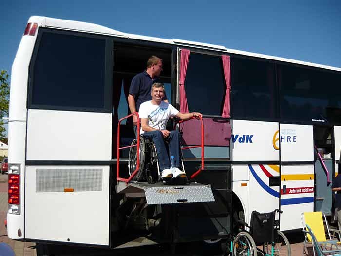 Neben diesen Problemen interessierten sich auch viele eingehend für diesen Reisebus, der auch Rollstuhlfahrern ein unbeschwertes Reisen ermöglicht. Ansprechpartner waren Karin Krug, Mitarbeiterin des VdK-Landesverbandes und Garbor Benke (Busfahrer). Sie hatten Unterstützung durch Ehrenamtler vor Ort wie Kreisvorsitzenden Bernd Reiber, seinen Stellvertreter Dietmar Buchardt, die Kreisgeschäftsführerin und Beraterin Katja Strohmeyer sowie weitere Kreisvorstandsmitglieder und engagierte Mitglieder aus dem Umfeld der beiden Stationen. Darunter waren Ronald und Ina Römer aus Artern, Rüdiger Herdin aus Roßleben, Dieter Pförtner aus Bleicherode, Ingrid und Manfred Müller sowie Christine Kahle aus Ilfeld, Gisela Fischer, Marlis Eicke und Jochen Reuter aus Ellrich oder Goldi Morcinek aus Bad Frankenhausen, Letztere zugleich Behindertenbeauftragte des Kyffhäuserkreises.