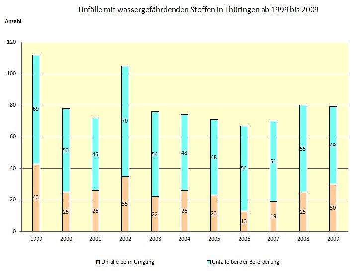 In Thüringen wurden im Jahr 2009 nach Mitteilung des Thüringer Landesamtes für Statistik 80 Unfälle mit wassergefährdenden Stoffen gemeldet, von denen 79 ausgewertet werden konnten. Unfälle sind plötzlich auftretende unvorhersehbare, zufällige Ereignisse, deren Häufung von Jahr zu Jahr kaum absehbar ist. Die Ursache bei mehr als der Hälfte aller Unfälle war auf menschliches Fehlverhalten zurückzuführen.