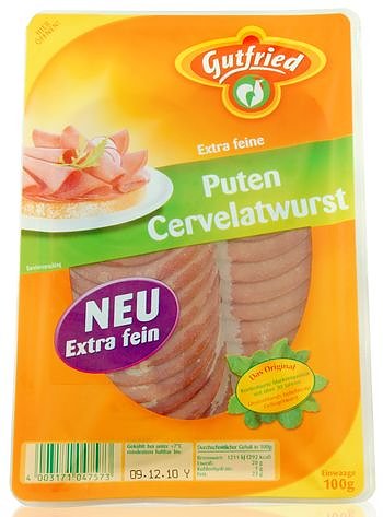In einer Wurst von Gutfried ist der Anteil von Schweinefleisch fast ebenso groß wie der von Putenfleisch. Während der Hersteller das Produkt jedoch groß auf der Vorderseite als "Puten Cervelatwurst" bewirbt, werden die Kunden nur im Kleingedruckten auf der Rückseite auf den Anteil Schweinefleisch hingewiesen. "Ein Schwein im Federkleid einer Pute - das ist irreführend und ärgerlich nicht nur für diejenigen, die aus religiösen Gründen Schweinefleisch meiden und sich auf die Produktbezeichnung verlassen", erklärte Anne Markwardt, Leiterin der foodwatch-Kampagne gegen Etikettenschwindel. Auf der Internetseite abgespeist.de können sich Verbraucher mit Protest-E-Mails direkt bei den Herstellern von Mogelprodukten beschweren.