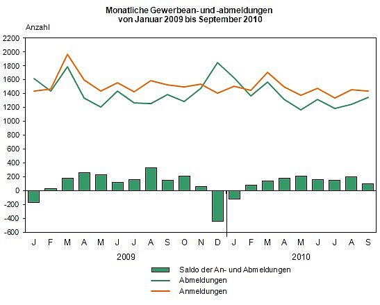 In den ersten neun Monaten 2010 war ein überdurchschnittlicher Anstieg der Zahl der Anmeldungen im Wirtschaftsabschnitt der Energieversorgung um 29,3 Prozent auf 609 Anträge festzustellen Etwa 85 Prozent werden dabei im Nebenerwerb ausgeübt. Hierzu zählt unter anderem auch der Betrieb von Photovoltaikanlagen. Die meisten Abmeldungen gab es ebenfalls im Handel mit 3 204 Anzeigen (Januar bis September 2009: 3 579) sowie im Bereich der sonstigen wirtschaftlichen Dienstleistungen mit 1 570 Anzeigen (Januar bis September 2009: 1 629).