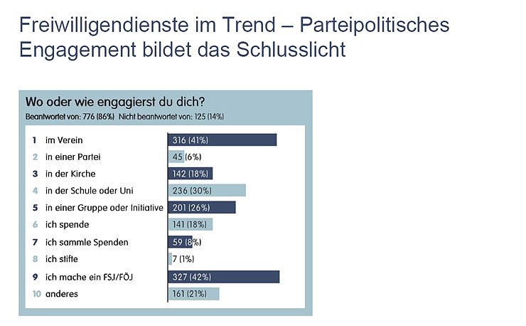 42 Prozent der teilnehmenden Jugendlichen absolvieren zum Zeitpunkt der Befragung ein Freiwilliges Soziales Jahr oder ein Freiwilliges Ökologisches Jahr. Fast ebenso viele sind in Vereinen aktiv (41 Prozent). An Schulen und Universitäten engagieren sich 30 Prozent der Befragten, in Kirchen 18 Prozent. Nur 6 Prozent der Befragten engagieren sich in politischen Parteien.