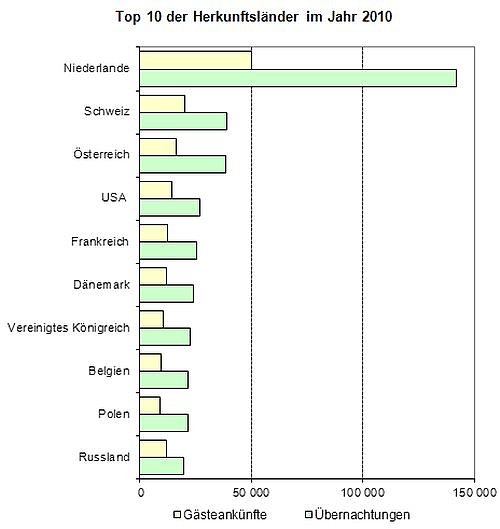 Wie bereits in den vergangenen Jahren buchten Gäste aus den Niederlanden mit Abstand die meisten Übernachtungen (142.000), was gegenüber 2009 allerdings einem Rückgang um 0,3 Prozent entspricht. Deutlich angestiegen ist hingegen die Zahl an Übernachtungen, die von Gästen aus Japan (+ 45,0 Prozent), Dänemark (+ 43,2 Prozent) und dem Vereinigten Königreich (+ 25,4 Prozent) gebucht wurden.