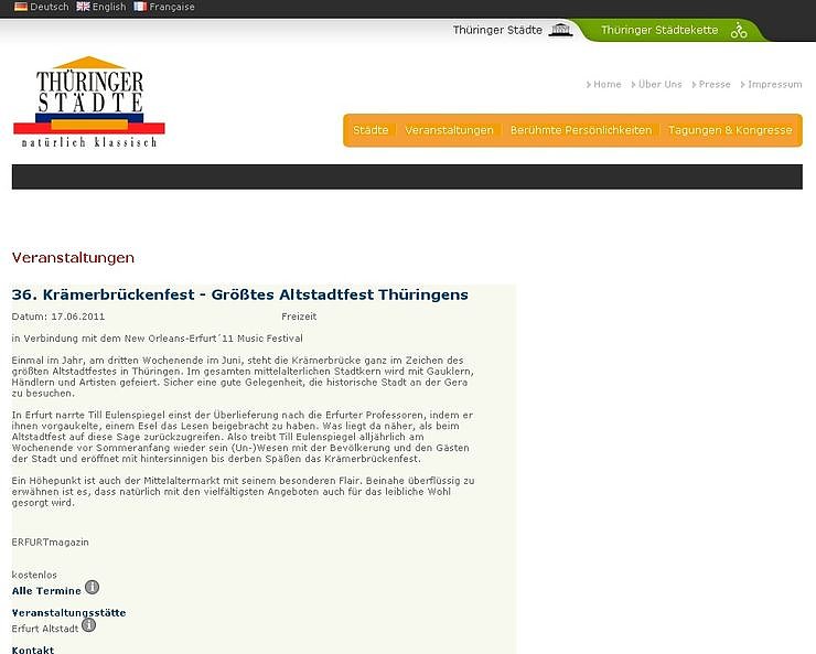 Pünktlich zum diesjährigen Saisonauftakt konnte der neue Veranstaltungskalender, der einen detaillierten Überblick über alle Veranstaltungen der 19 Thüringer Städte auf der Webseite www.thueringer-staedte.de gibt, vorgestellt werden. Er ist eine neue und einzigartige Veranstaltungsplattform für ganz Thüringen und ermöglicht durch seine langfristige Veranstaltungsvorschau eine verbesserte Reiseplanung.
