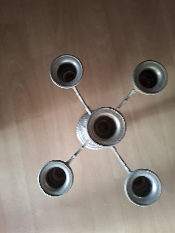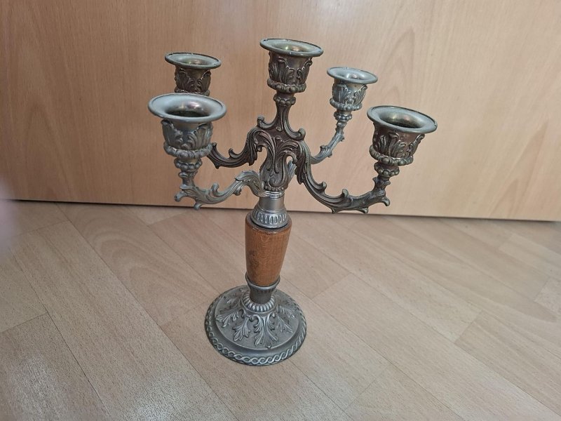 Biete: Vintage französischer fünfarmiger Kerzenständer aus Messing mit Tigeraugenstein