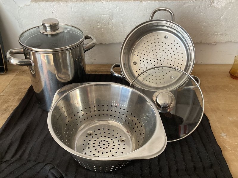 Biete die abgebildeten Töpfe und ein Sieb, alles Edelstahl, sehr guter Zustand.