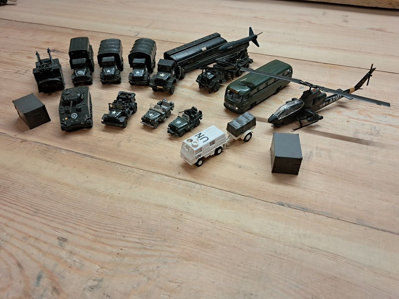 Biete Sammlung an Militärfahrzeugen (US, UN) von Roco, Wiking und Brekina (Hersteller vom Hubschrauber unbekannt) im Maßstab 1:87, passend für H0,