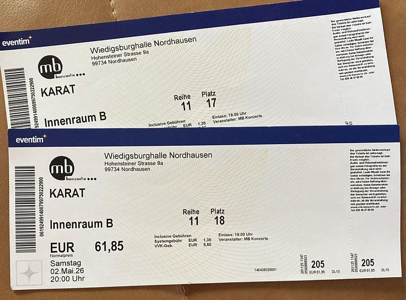 Karat-Tickets (Foto: ) 2 Karten für Karat Konzert in Nordhausen am 02.05. in der Wiedigsburg Halle, Sitzplätze, 50 € pro Karte