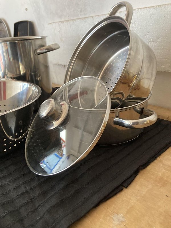 Biete die abgebildeten Töpfe und ein Sieb, alles Edelstahl, sehr guter Zustand.