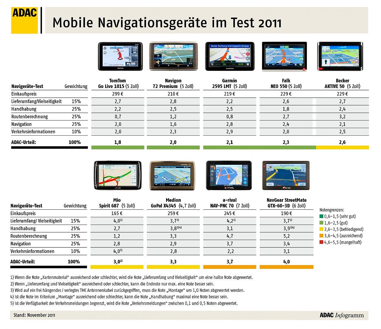 Das große Display hat dann den gleichen Effekt wie der „Tote Winkel“. Außerdem sind die Großen bei der Routenführung nicht übersichtlicher als Geräte mit bis zu fünf Zoll. Das hat der ADAC in einem Test von neun Navigationsgeräten zwischen fünf und sieben Zoll herausgefunden. Sieger beim ADAC Vergleich ist das Modell Go Live 1015 von TomTom (fünf Zoll), Testverlierer ist das Modell StreetMate GTX-60-3D von NavGear (sechs Zoll). Insgesamt erreichen vier Geräte das Urteil „gut“, drei die Bewertung „befriedigend“ und zwei schneiden mit „ausreichend“ ab. Kein Produkt erhielt die Note „sehr gut“.