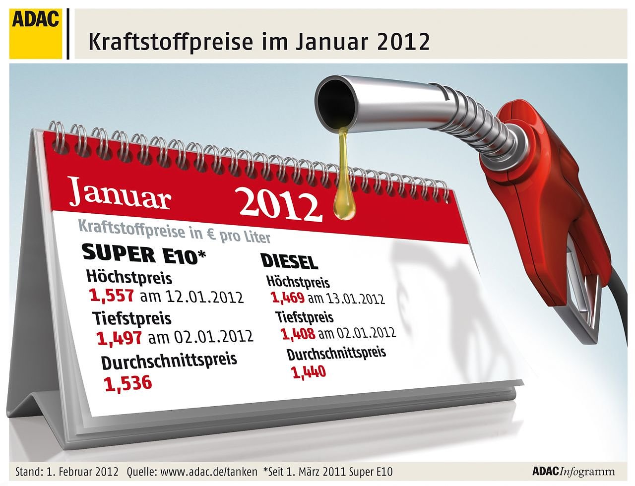 Der ADAC weist darauf hin, dass aufgrund der unterschiedlichen lokalen Marktpreisbildung die Preise teilweise massiv voneinander abweichen. Nach Empfehlung des Clubs sollten Autofahrer die Preisspitzen, die die Mineralölkonzerne regelmäßig am Markt durchzusetzen versuchen, nach Möglichkeit überbrücken und zu einem späteren – meist wieder günstigeren – Zeitpunkt tanken. Detaillierte Informationen zur Preisentwicklung auf dem Kraftstoffmarkt findet man unter www.adac.de/tanken.