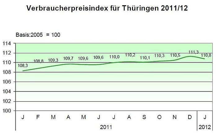 Der Verbraucherpreisindex stieg in Thüringen im Januar 2012 nach Mitteilung des Thüringer Landesamtes für Statistik im Jahresvergleich um 2,3 Prozent. Gegenüber dem Vormonat Dezember 2011 sanken die Preise im Durchschnitt um 0,4 Prozent. Sie erreichten einen Indexstand von 110,8 (Basis 2005=100). Die Jahresteuerungsraten liegen seit März 2011 meist zwischen 2,1 und 2,4 Prozent.