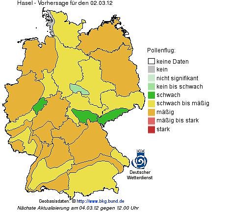 Logo (Foto: DWD) Logo (Foto: DWD) "Tipps in Radio und Tageszeitung oder ein Blick auf die Internetseite des Deutschen Wetterdienstes (DWD) liefern tagesaktuelle, regionale Informationen über den Flug der wichtigsten Pollen. Wer gegen Hasel, Erle, Birke und Co allergisch ist, kann sich so gezielt wappnen", empfiehlt Dr. Utta Petzold, Allergologin bei der Barmer. Gänzlich entgehen kann man der Belastung durch Pollen zwar nicht, so die Expertin. Bewährte Tipps helfen Pollenallergikern aber leichter durch den Alltag zu kommen: