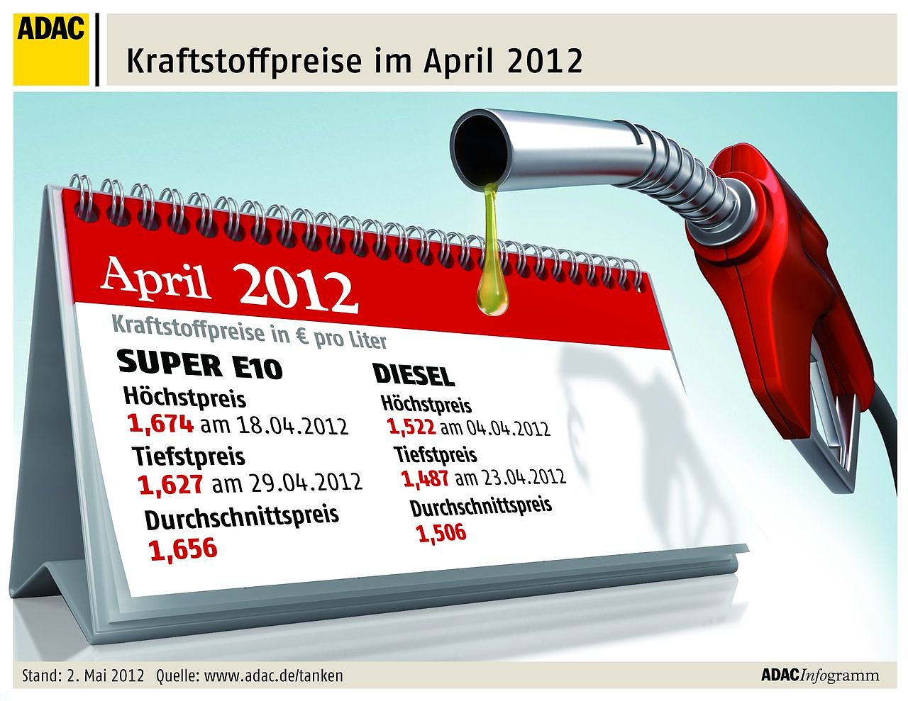 Nach Angaben des ADAC war Diesel dagegen im April etwas günstiger als im März. So kostete ein Liter im Monatsmittel 1,506 Euro – 1,6 Cent weniger als im März. Erfreulich für Dieselfahrer: Die Preisdifferenz zwischen den beiden Kraftstoffsorten wuchs damit auf 15 Cent. Teuerster Tag zum Tanken war für Dieselfahrer der 4. April bei einem Tagesdurchschnittspreis von 1,522 Euro. Am billigsten war es am 23. April mit 1,487 Euro. Insgesamt war das Preisniveau im April für beide Sorten sehr hoch, auch die im Laufe des Monats zu beobachtenden Preisrückgänge bei Rohöl wurden nur verspätet von den Mineralölkonzernen an die Autofahrer weitergegeben.