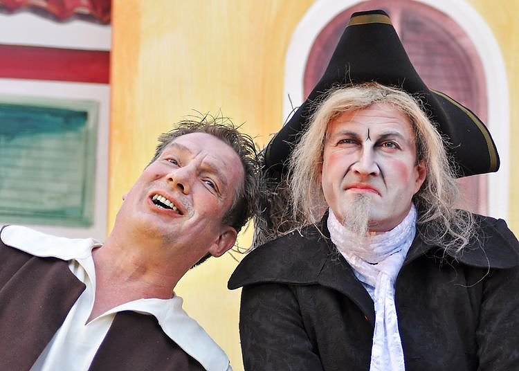Der listige Scapin (Matthias Mitteldorf) verabschiedet sich am Samstag von seinem Nordhäuser Publikum. Monsieur Argante (Klaus Heydenbluth) wird es recht sein, nicht mehr länger von ihm übers Ohr gehauen zu werden.