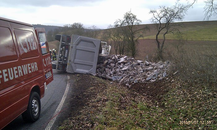 Das recht neue Fahrzeug, dass mit Bauschutt beladen war, kippt nach rechts in den Straßengraben. Durch den Aufprall wurden Zugmaschine und Fahrerhaus erheblich zerstört, die Ladung landete im Straßengraben.