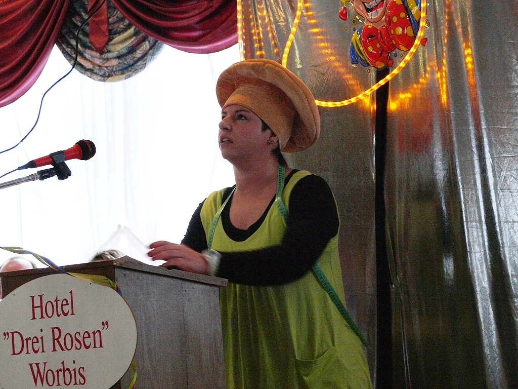 Publikum gedacht war. Aber im Saal saßen auch einige Herren, die vielleicht gern weniger wiegen würden und so brauchte sich Yvonne keine Gedanken zu machen, ob die Bütt ankommt. Sie kam – und wie. Das Gelächter war groß und die junge Frau wurde immer wieder vom Worbiser Schlachtruf unterbrochen. Großer Beifall zum Schluss und sie gab das Verprechen ab: beim nächsten Jahr ist sie wieder dabei.