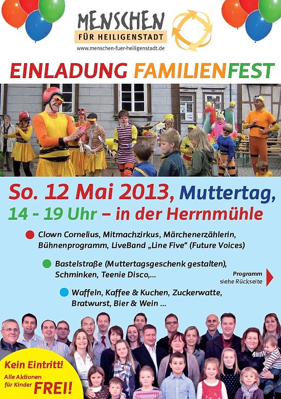 Die Bürgerinitiative Menschen für Heiligenstadt lädt am 12. Mai alle Bürgerinnnen und Bürger der Stadt und den Ortsteilen von Heiligenstadt zu ihrem diesjährigen Familienfest in die Herrnmühle ein...