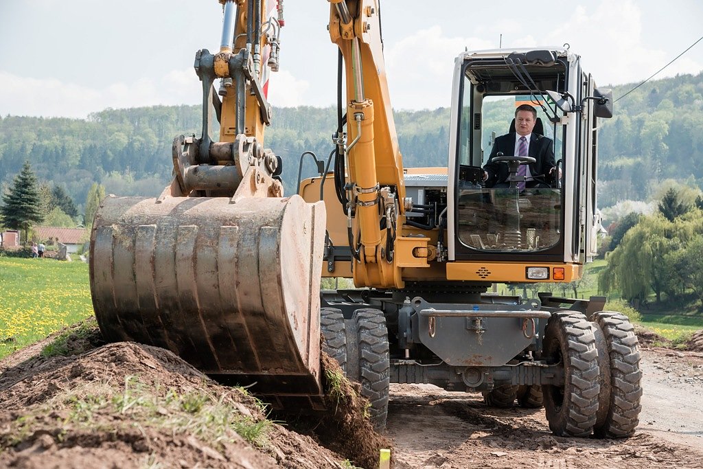 Heute Nachmittag nahmen Vertreter der Stadt, des Zweckverbands Wasserversorgung und Abwasserentsorgung Obereichsfeld (WAZ) sowie weiterer Erschließungsträger den offiziellen Spatenstich vor. Statt mit einem Spaten wurde mit großem Gerät gearbeitet. Bürgermeister Thomas Spielmann steuerte dabei persönlich den Baggerarm.