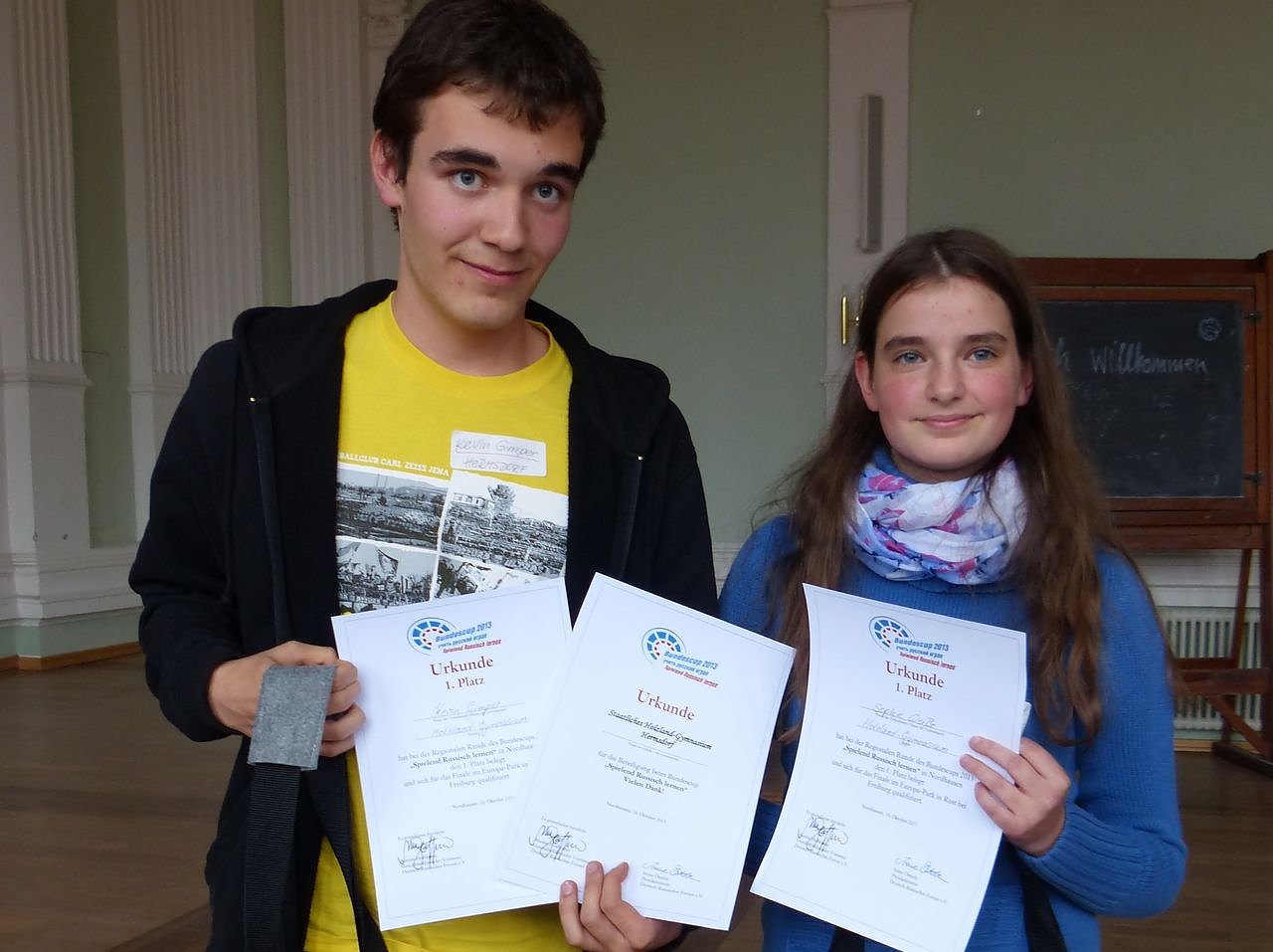 Das heutige Regionalfinale hat die Mannschaft aus Hermsdorf vom Holzland-Gymnasium (Bild) gewonnen - Kevin Gimper und Sophie Weiße. Platz 2 ging an Janine Rothensee und Elisabeth Lange (Marie-Curie-Gymnasium, Worbis) und auf den dritten Platz kamen Charlotte Richter und Carolin Schwanstecher (Katholisches Gymnasium Heiligenstadt).