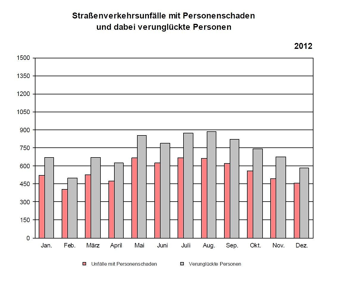 Seit Jahresbeginn verunglückten 532 Personen weniger im Straßenverkehr und die Zahl der Verunglückten sank auf 5 331 Personen. Rund 88 Prozent aller Unfälle waren Unfälle mit nur Sachschaden. Ihre Anzahl sank in den ersten acht Monaten 2013 um 0,4 Prozent auf 31 452 Unfälle. Die Zahl der Unfälle mit Personenschaden verringerte sich signifikant um 8,2 Prozent auf 4 172 Unfälle. Bei diesen Unfällen kamen von Januar bis August dieses Jahres 76 Menschen auf Thüringer Straßen ums Leben.