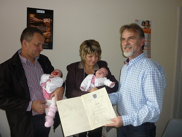 Autor: enFamilie Marx war nun mit ihren acht Wochen alten Zwillingsmädchen Anne-Marie und Anne-Sophie ins zuständige Landratsamt nach Mühlhausen eingeladen worden. Dort überreichte Landrat Harald Zanker stellvertretend für Ministerpräsidentin Christine Lieberknecht die Ehrenpatenschaftsurkunde für das Schwesternpaar. Denn die Mädchen sind die 5. und 6. Kinder der Familie aus Diedorf. Mit der Anerkennung der Ehrenpatenschaft ist ein Geldgeschenk in Höhe von 1.000 Euro verbunden, worüber sich die Eltern sehr freuten.