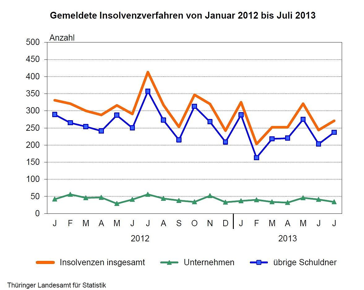 Die voraussichtlichen Gläubigerforderungen bezifferten die Gerichte auf rund 291 Millionen Euro. Pro Verfahren standen Forderungen von durchschnittlich 156 Tausend Euro aus. Die Anzahl der Unternehmensinsolvenzen ging in den ersten sieben Monaten 2013 gegenüber 2012 um 53 Verfahren bzw. 16,7 Prozent auf 264 Unternehmen zurück. Diese insolventen Unternehmen beschäftigten zum Zeitpunkt des Antrages noch 1 925 Arbeitnehmer.