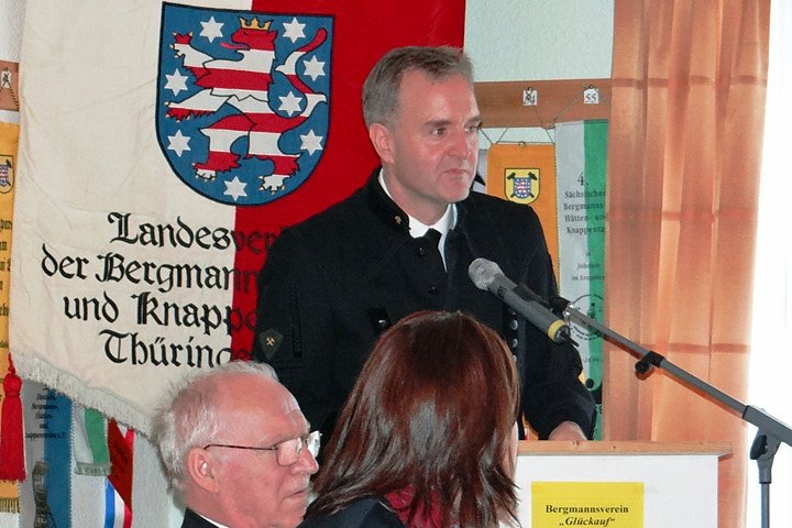 Die Begrüßung hatte Helmut Grotsch vorgenommen. Er, wie auch später Günter Otto vom Bergmannsverein Sondershausen, wiesen auf die lange Tradition des Bergbaus in Sondershausen hin (120 Jahre Bergbau in Sondershausen) und des Jubiläums 20 Jahre Landesverband.