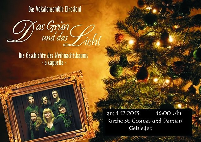 Am 1. Dezember wird zu einem Konzert in die Kirche St. Cosmas und Damian in Geisleden eingeladen. In seinem neuen Winterprogramm erzählt das Vokalensemble Eiresioni die Geschichte vom Weihnachtsbaum und berichtet in den Originalsprachen von den immergrünen Bräuchen des europäischen Weihnachtsfestes....