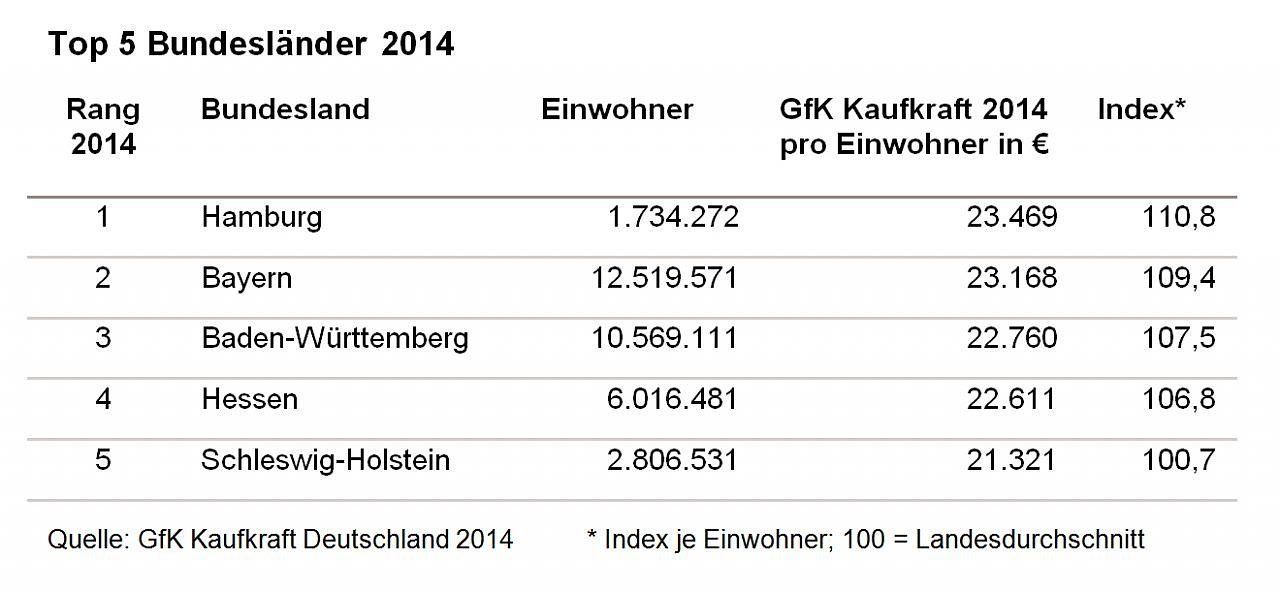 Auf Ebene der Bundesländer erhöht Hamburg mit 110,8 Indexpunkten den Vorsprung gegenüber Bayern (Index: 109,4). Auf dem dritten Platz behauptet sich Baden-Württemberg (Index: 107,5) vor Hessen (Index: 106,8). Sechs der 16 Länder weisen eine überdurchschnittliche Kaufkraft pro Kopf auf. Nordrhein-Westfalen markiert in etwa den Bundesdurchschnitt. Die ostdeutschen Bundesländer liegen noch immer unter dem gesamtdeutschen Pro-Kopf-Durchschnitt. Das Schlusslicht bildet Sachsen-Anhalt mit 17.336 Euro pro Kopf.