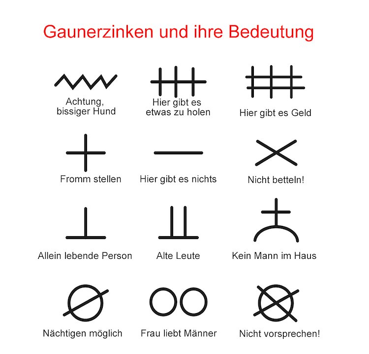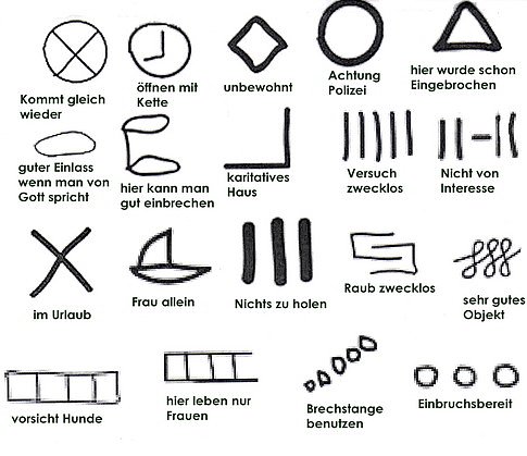 Ein besonderes Phänomen, das in letzter Zeit wieder in verschiedenen Bundesländern auftaucht, sind die sogenannten Gaunerzinken. Eine oder zwei Personen baldowern die Häuser aus und hinterlassen Zeichen für die nachrückenden Täter, die dann die Einbrüche begehen. Diese Zeichen werden an Briefkästen, Zäunen, an der Fassade, an Laternenmasten oder auch auf Fußwegen hinterlassen. Sie sollen den Einbrechern zeigen, wo es sich lohnt einzubrechen oder wo gewisse Gefahren lauern.