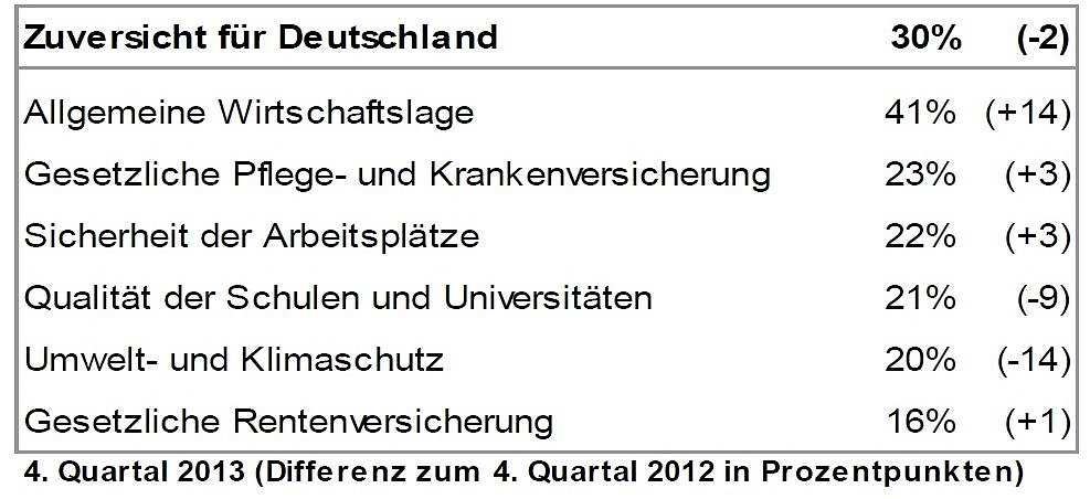 Die insgesamt verbesserte wirtschaftliche Situation und die allmählich bessere Lage auf dem Arbeitsmarkt sorgen für bessere Laune in den neuen Bundesländern und machen Hoffnung, dass sich der Aufwärtstrend fortsetzt. Für das Bildungssystem sind die Menschen in Ostdeutschland Bundesländern dagegen deutlich skeptischer als vor einem Jahr: 21 Prozent erwarten hier in den kommenden zwölf Monaten Fortschritte. Das sind neun Prozentpunkte weniger als im vierten Quartal 2012.