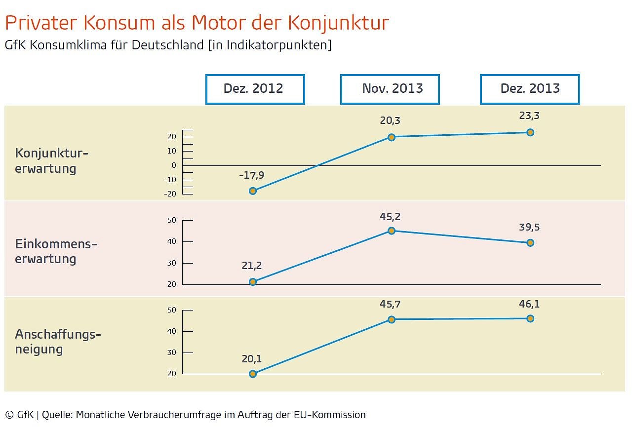 Und das ist nur das i-Tüpfelchen auf einer insgesamt guten privaten Nachfrage im Jahr 2013. Laut Statistischem Bundesamt stieg das Bruttoinlandsprodukt im 3. Quartal um 1,1 Prozent; dazu haben die privaten Haushalte allein 0,9 Prozentpunkte beigetragen. Ähnlich dominant war die Rolle des Privatkonsums schon im ersten und im zweiten Quartal. Er war 2013 der wichtigste Antrieb für die Konjunktur in Deutschland – und wird es wohl auch 2014 wieder werden.