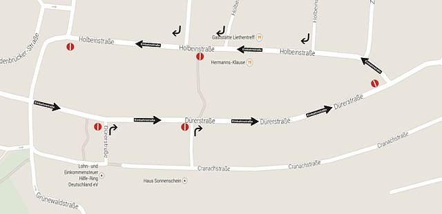Das Einbahnstraßensystem im Wohngebiet Auf den Liethen wird um die Straßen Holbeinstraße und Dürerstraße erweitert. Unter Berücksichtigung der äußerst engen Straßen, dem Parkverhalten der Anwohner und der Notwendigkeit...