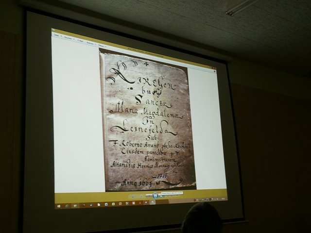 Die meisten Leute haben sicher noch nie ein Kirchenbuch gesehen. Die Kirchenbücher sind sehr wertvoll und nicht zu ersetzen. Deshalb sind sie unter Verschluss und werden nur von einem bestimmten Kreis an Personen gesichtet, wenn Bedarf besteht. Gerd Leukefeld zeigte auch, dass diese Bücher ohne spezielle Handschuhe nicht angefasst werden dürfen. Dank des Leinefelder Dechants Berhard Wehner konnte Gerd Leukefeld zum Vortrag einige dieser wertvollen Bücher zeigen. Das Älteste stammte aus dem Jahr 1664.