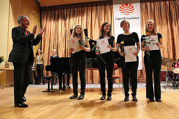 Friederike Brokmann, Blockflöte / Ilmenau, Judith Wolff, Blockflöte / Ilmenau, Elisabeth Bronisch, Blockflöte / Goldbach und Felicia Maria Roennecke, Blockflöte / Erfurt. Überreicher der Vorstandsvorsitzende der Lyffhäusersprakasse Ulrich Heilmann