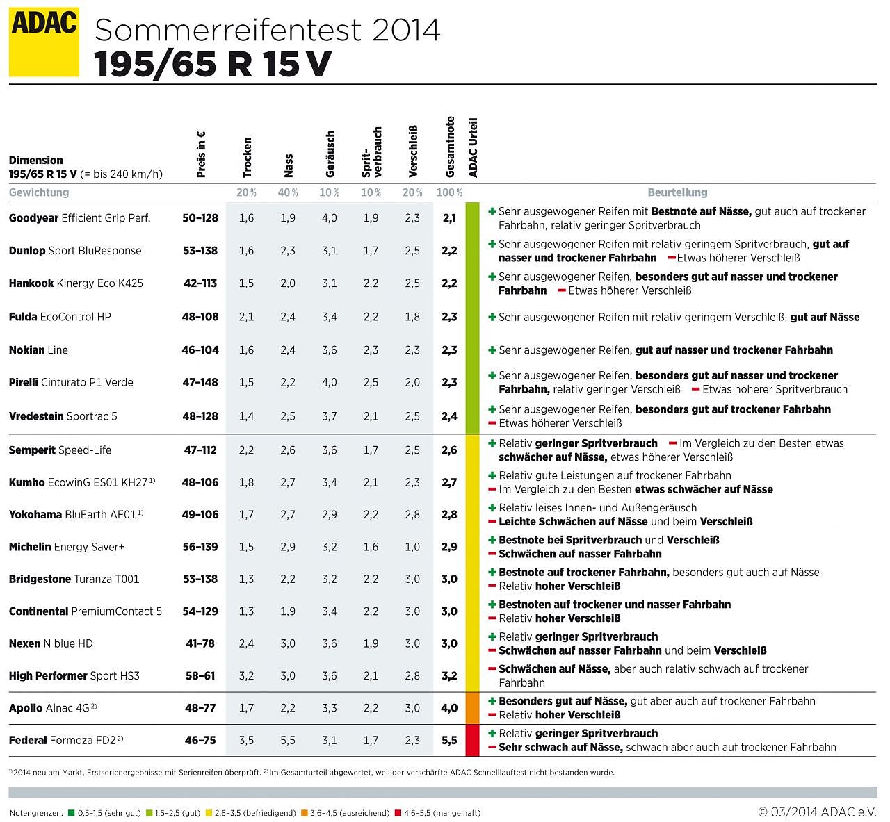Dimension 175/65 R14T: Die Reifen von Continental, Hankook, Pirelli, Bridgestone, Falken und Nokian überzeugen in allen Testaspekten und erhalten daher ein gut. Die Produkte von Firestone, Michelin, Barum und Vredestein werden mit befriedigend bewertet. Sie zeigen im Gesamtbild - über alle Testkategorien hinweg - leichte Schwächen. Auch der Goodyear-Reifen und der Semperit bekommen ein befriedigend. Grund dafür war deren Fahrverhalten auf nasser Fahrbahn. Beim Avon ZT5 zeigen sich Schwächen auf trockener Fahrbahn sowie deutliche Probleme auf nassem Untergrund. Er wird mit ausreichend bewertet. Die Produkte von Debica, Kormoran und Kleber zeigen alle sehr schwache Fahrleistungen auf nasser Fahrbahn. Sie werden daher mit mangelhaft benotet.