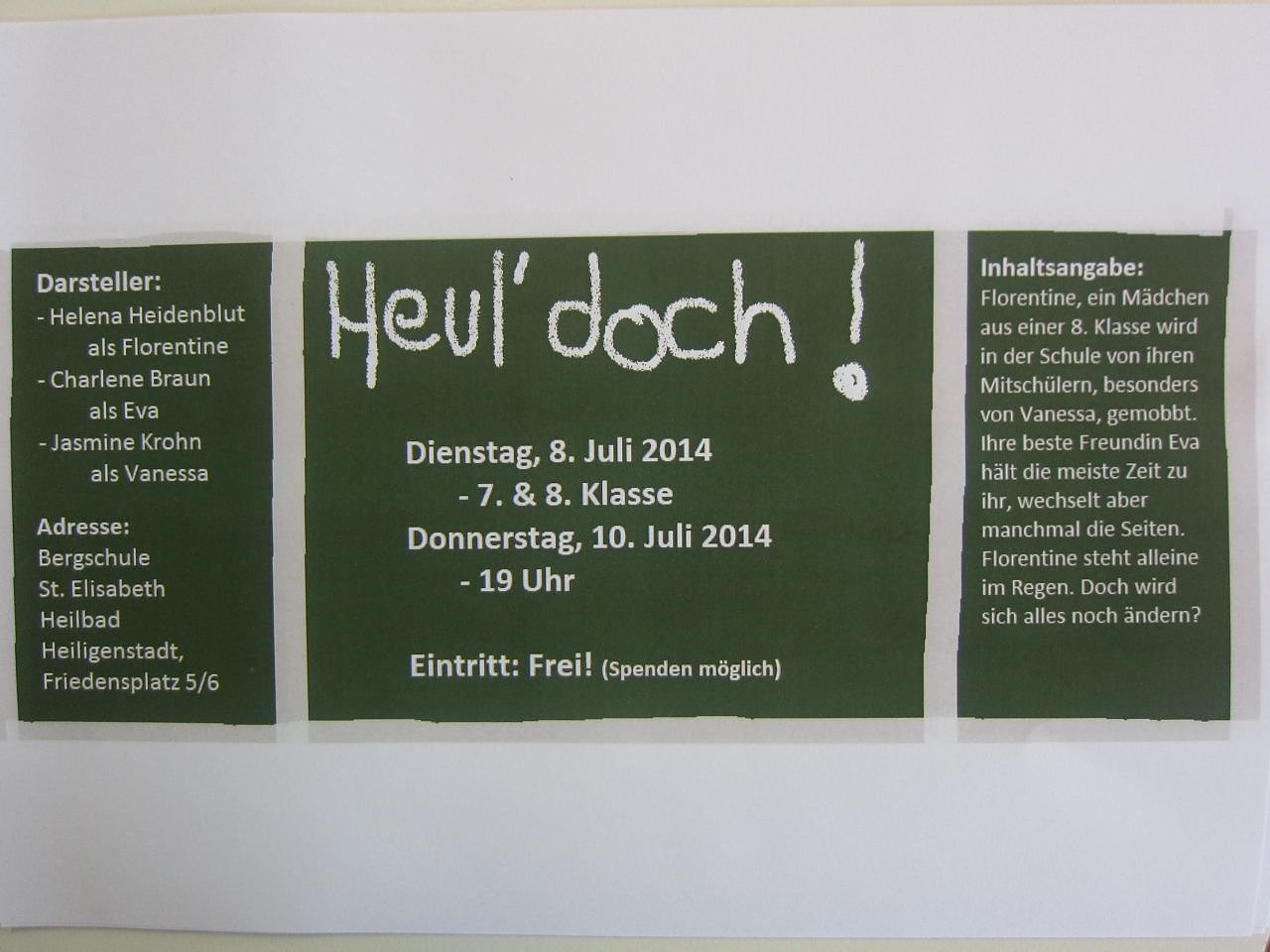 Der 9er Kurs "Darstellen und Gestalten" führt die diesjährige Produktion, das Schulmusical "Heul doch", am kommenden Donnerstag, 10. Juli 2014 um 19 Uhr in der Aula der Bergschule in Heilbad Heiligenstadt in einer öffentlichen Aufführung vor....