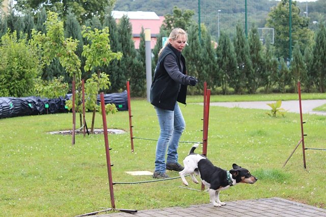 In der Vorführung, die von kräftigen Regenschauern begleitet war, galt es Hindernisse zu bewältigen und zur Freude der Zuschauer kleine Kunststückchen vorzuführen. Besonders interessant war aber für alle zu sehen, wie ein Suchhund agiert.