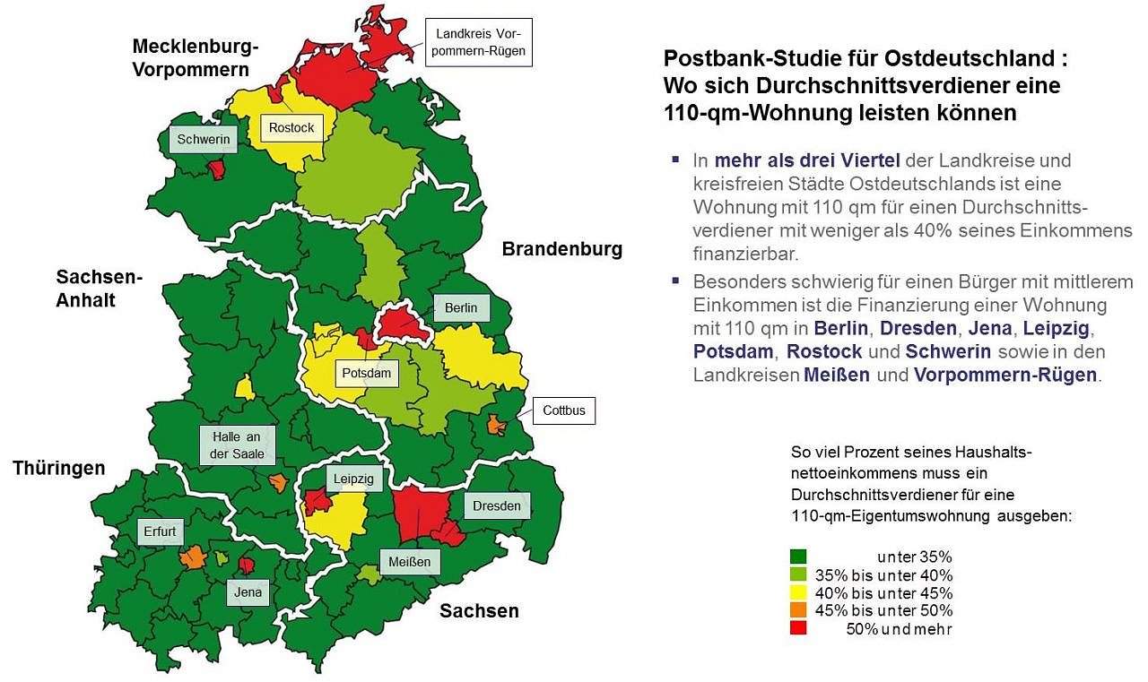 Haushalte mit mittlerem Einkommen finden unter anderem in Weimar, Chemnitz und Gera finanzierbare 110-Quadratmeter-Wohnungen. "Wer etwas mehr Erspartes mitbringt, findet beispielsweise auch in Magdeburg und Brandenburg an der Havel bezahlbare Immobilien dieser Größenordnung", sagt Georg Hoogendijk, Geschäftsführer der Postbank Immobilien GmbH.